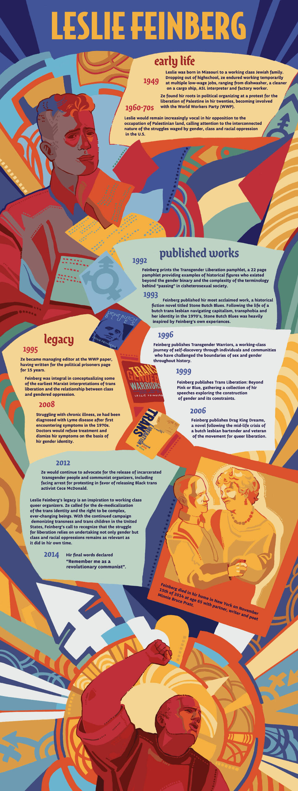An infographic for my informational illustration class on the legacy of writer and activist Leslie Feinberg, focused on communicating effectively through design hierarchy while remaining visually appealing and relevant to the subject matter at hand.