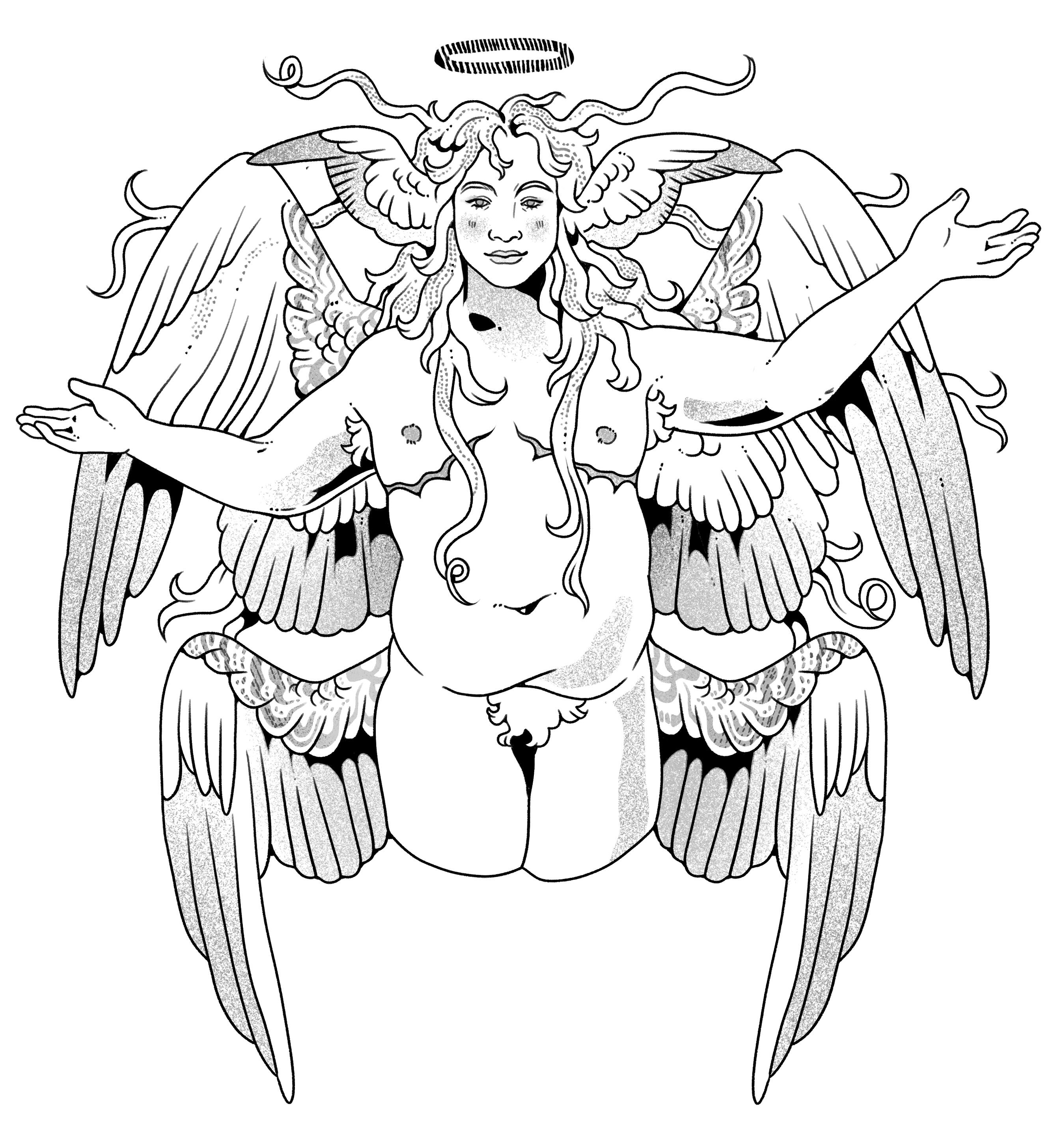 Cupid is a Hamilton-based illustrator, tattoo apprentice and novel artist who specializes in intricate linework, bold colours and decorative borders.Their work centers queerness, nature and the importance of community. The angels, dragons and rich borders that frame their work explore the ever-expanding world of literature and blur the boundaries between the imagined and reality.Outside of illustration, you can find Cupid crafting jewelry and textiles, baking some sweet treats or watching Twin Peaks.They are currently an apprentice at Lowk’ai Tattoo Collective in Hamilton ON.